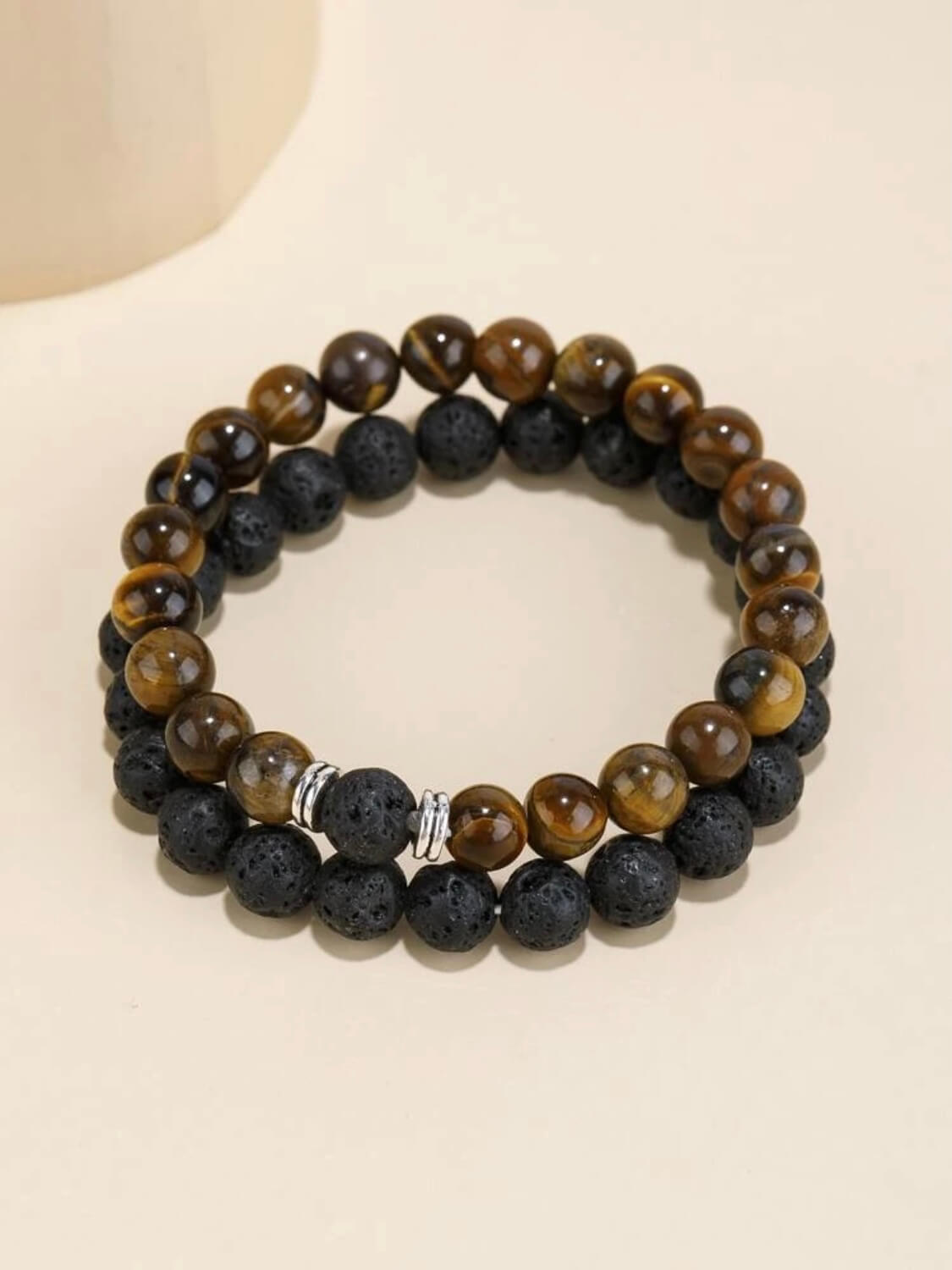 זוג צמידים עם חרוזים בצבע שחור וחום. צמידים עם סגנון ייחודי ושילוב של כסוף ומבריק. עשויים מחרוזי אבן בעבודת יד, עמידים למים.
