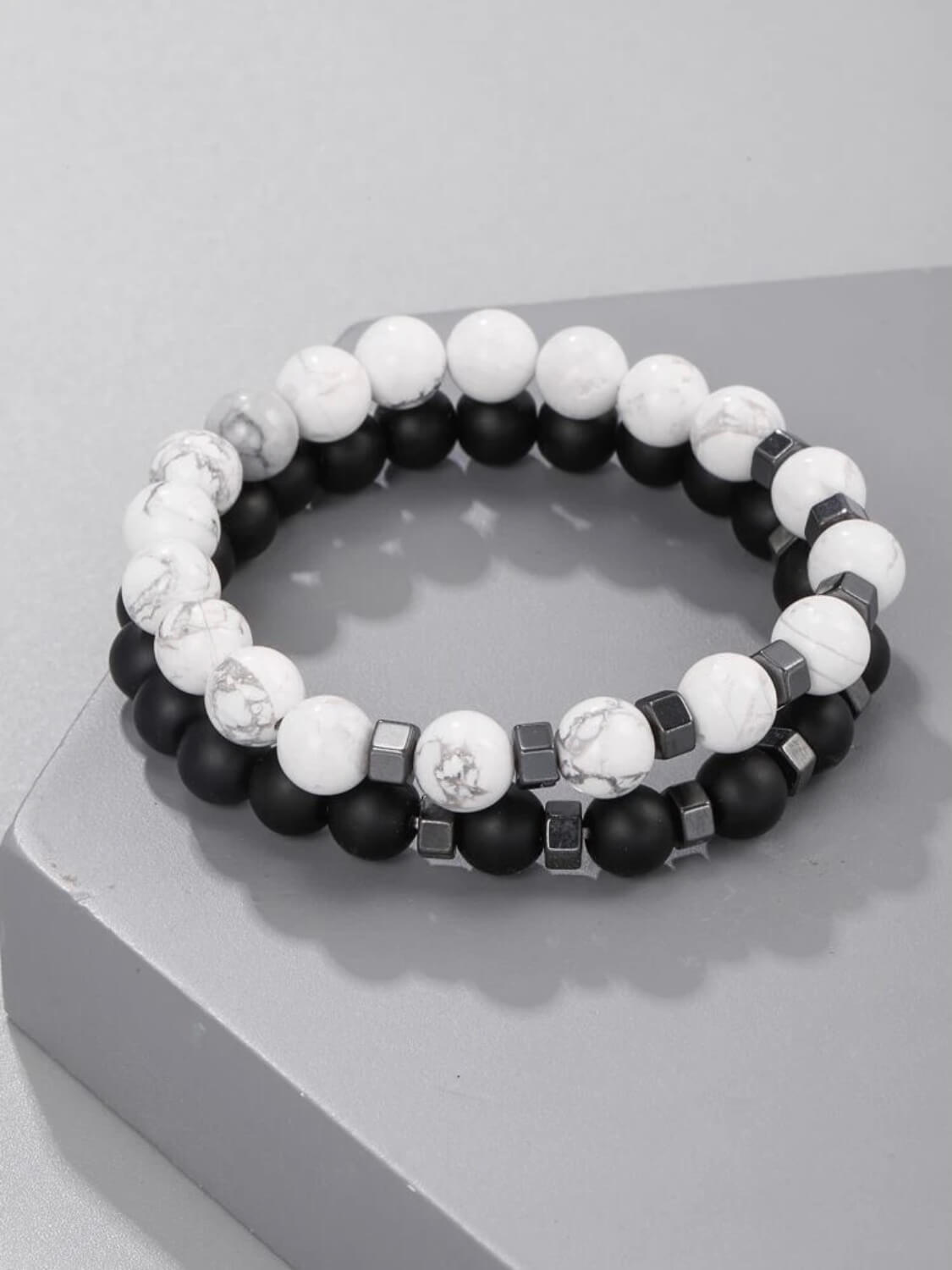זוג צמידים עם חרוזים בצבע לבן כסוף ושחור. צמידים ללוק אלגנטי ולא מתאמץ. עשויים מחרוזי אבן בעבודת יד, עמידים למים.