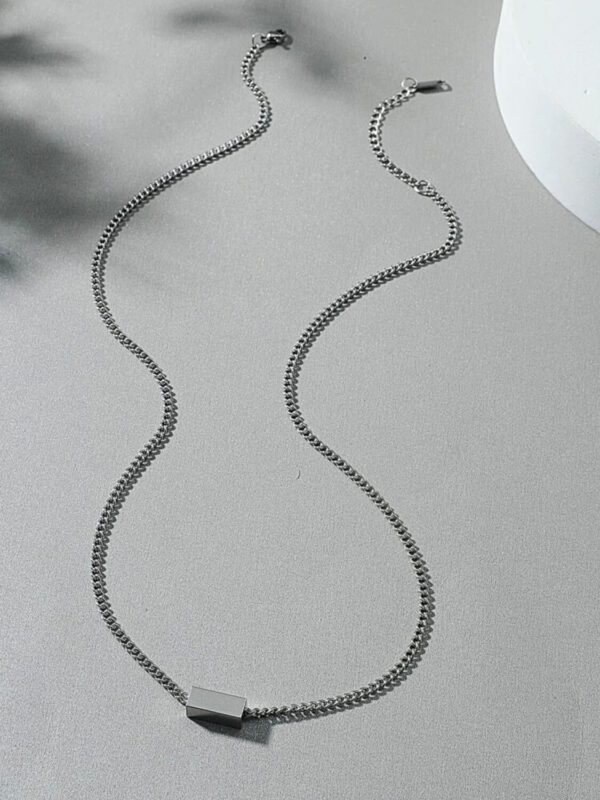 שרשרת עם תליון מלבן בצבע כסוף. שרשרת טרנדית וקלאסית שתתאים לכל לוק. עשויה מפלדת אל-חלד, עמידה במים.